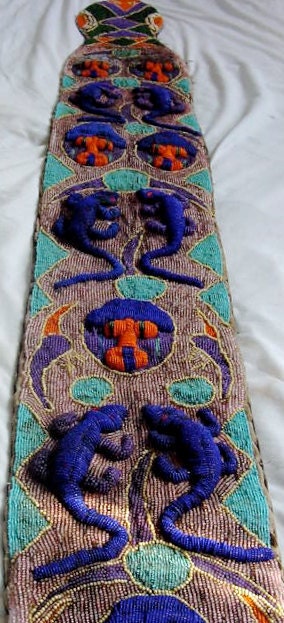 My appreciation of Yorba Tribe philosophy, started with an etsy search a year ago. I discovered this sash with stuffed, raised, quilted lizards and monkeys covered with generous hand beading, in uncommon color combinations, that oddly feel timeless.